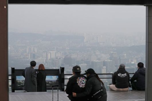 14일 오전 서울 남산에서 시민들이 뿌연 시내를 바라보고 있다. 연합뉴스 |
