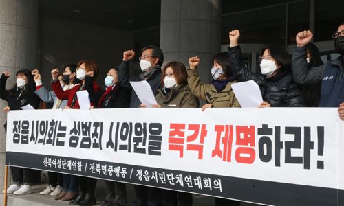 앞서 전날 정읍시민단체연대회의와 전북민중행동, 전북여성단체연합 등 지역 55개 시민사회단체는 성명을 내고 동료 여성의원을 강제추행한 혐의로 기소돼 징역형을 선고받은 정읍시의회 A의원에 대한 퇴출을 요구했다.