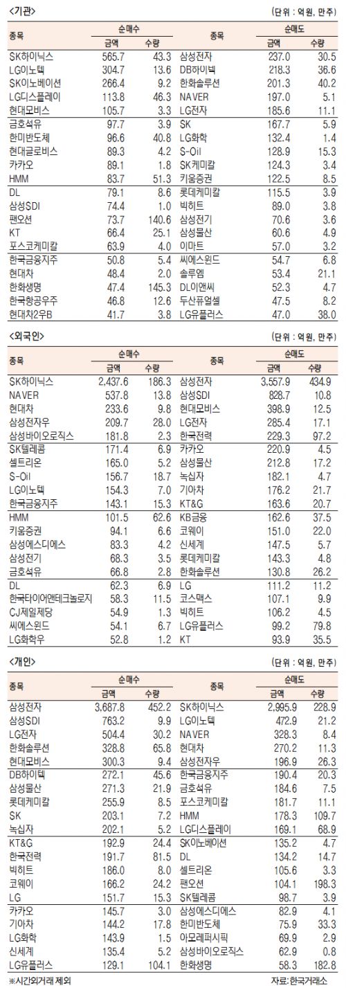 [표]유가증권 기관·외국인·개인 순매수·도 상위종목(2월 19일)