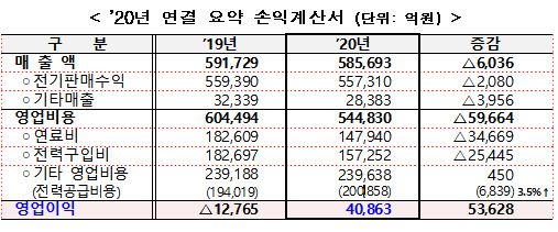 [이데일리 문승관 기자] 한국전력은 19일 지난해 저유가 덕에 4조1000억원에 이르는 영업이익을 올렸다고 발표했다. 코로나19로 국제 연료 가격이 하락하면서 발전자회사 연료비와 민간발전사 전력구입비가 전년의 36조5000억원에서 지난해 30조5000억원으로 6조원 가량 급감한 것이 결정적 원인이다. 코로나19 확산으로 전력 사용량이 크게 줄었지만 지난해 한국전력은 3년 만에 흑자 전환에 성공했다.