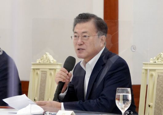 문재인 대통령이 19일 오전 청와대 본관에서 열린 더불어민주당 지도부 초청 간담회에서 인사말을 하고 있다. [연합] |