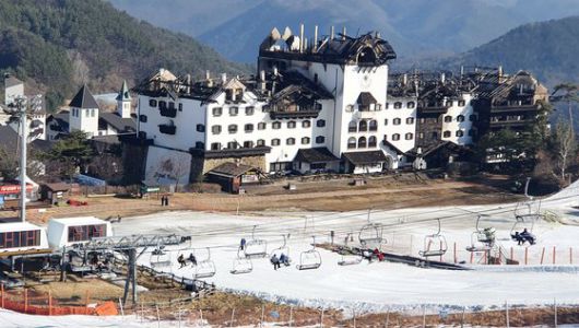전북 무주군에 위치한 덕유산 리조트 티롤호텔이 지난 20일 밤 11시 40분께 화재가 발생해 4시간 50분 만에 완전히 진화된 21일 스키장에서 바라본 호텔이 검게 그을려 있다. 독자 제공=뉴시스 |