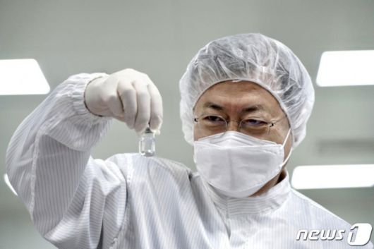 문재인 대통령이 지난달 20일 오전 경북 안동시 SK바이오사이언스 공장을 방문해 코로나19 백신을 살펴보고 있다. /사진=뉴스1 |