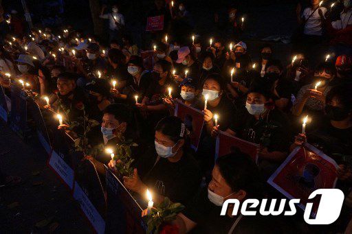 미얀마 군부에 대항하는 시위대가 양곤 주재 미국 대사관 앞에서 촛불시위를 벌이고 있다. © AFP=뉴스1 |