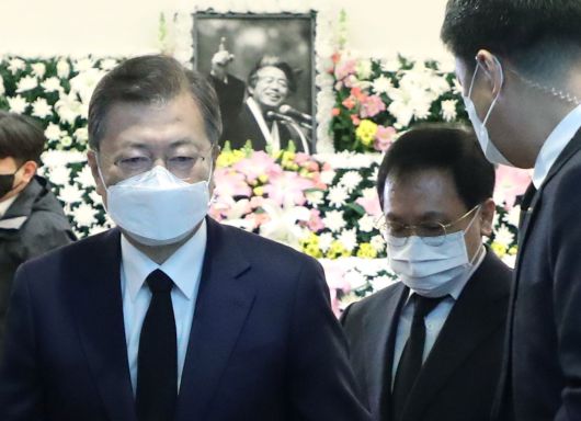 문재인 대통령이 지난 17일 오전 서울 종로구 서울대학교병원 장례식장에 마련된 고 백기완 통일문제연구소장 빈소를 조문하고 빈소를 나서고 있다. /연합뉴스 |