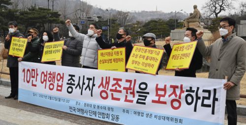 22일 오전 청와대 앞 분수대에서 전국 여행사 단체 연합으로 구성된 여행업 생존 비상대책위원회가 집회를 열고 집합금지 업종에 준하는 재난지원금 지원, 관광산업 재난업종 지정 등 5가지 요구사항을 발표하고 있다./오승현 기자 2021.02.22 /오승현 기자 story@sedaily.com[ⓒ 서울경제, 무단 전재 및 재배포 금지]