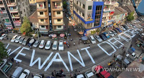 미얀마 도로에 적혀 있는 민주주의 회복 구호 |