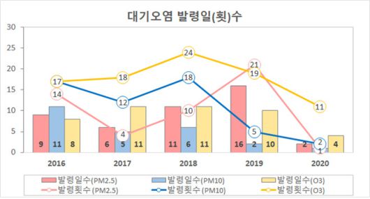 2020년 부산시 대기오염 주의보 발령일수는 초미세먼지(PM-2.5) 2일(1회), 미세먼지(PM-10) 1일(2회), 오존(O3) 4일(11회)로 전년 대비 감소한 것으로 나타났다.