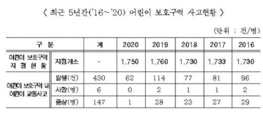 지난해 어린이 보호구역에 대한 무관용 원칙 적용 지속적인 단속실시로 단속건수는 18만4413건으로 2019년 대비 17% 증가한 반면 사고건수는 2019년 114건에서 62건으로 45.6%가 감소했으며 특히 사망사고는 1건도 발생하지 않았다.