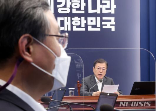 [서울=뉴시스]박영태 기자 = 문재인 대통령이 22일 청와대에서 열린 수석·보좌관 회의에 참석해 발언하고 있다. 왼쪽은 신현수 민정수석. 2021.02.22. since1999@newsis.com |