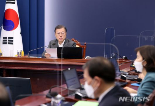 [서울=뉴시스]박영태 기자 = 문재인 대통령이 22일 청와대에서 열린 수석·보좌관 회의에 참석해 발언하고 있다. 2021.02.22. since1999@newsis.com |