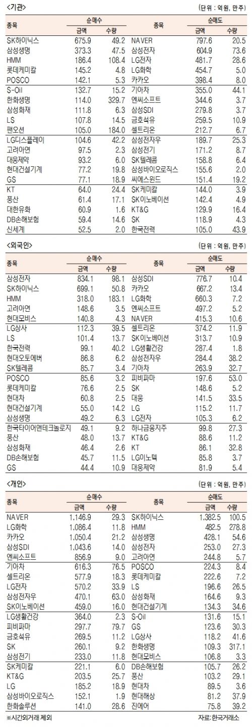 [표]유가증권 기관·외국인·개인 순매수·도 상위종목(2월 22일)