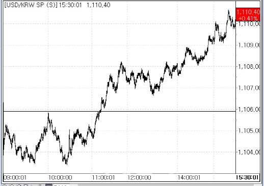서울외국환중개에 따르면 원·달러 환율은 전 거래일 종가(1105.90원) 대비 4.50원(0.41%) 오른 1110.40원에 마감했다. 이날 환율은 1100원대 초반에서 횡보하며 장중 1103.40원까지 내렸다가 오전 11시 15분께 상승 전환했다. 오후 들어 1100원 후반으로 상승폭을 키우다 1110원을 돌파했다. 원·달러 환율이 종가 기준으로 1110원을 넘긴 것은 지난 9일(1116.60원) 이후 7거래일 만이다.