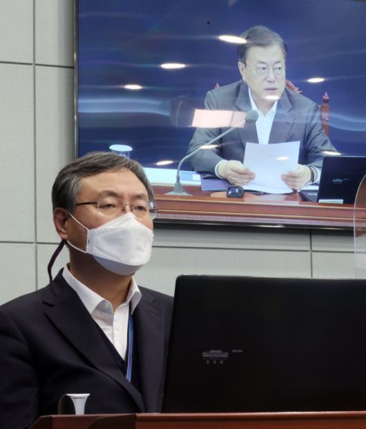 신현수 민정수석(왼쪽)이 22일 청와대에서 열린 수석·보좌관회의에 참석해 문재인 대통령의 발언을 듣고 있다. 뉴시스 |