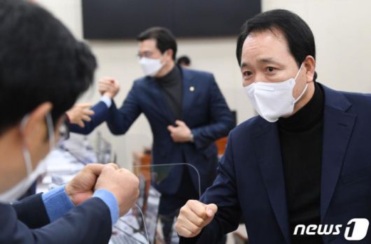 성일종 국민의힘 간사가 지난 16일 서울 여의도 국회에서 열린 정무위원회 전체회의에서 여당 의원들과 인사하고 있다. /사진=뉴스1 |