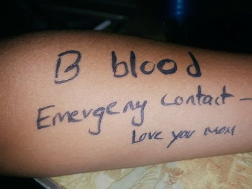 혈액형과 긴급 연락처를 팔뚝에 적은 모습. |