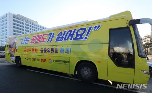 [서울=뉴시스]배훈식 기자 = 한국주식투자자연합회 공매도 폐지 홍보 버스가 4일 오전 서울 여의도 국회의사당 앞을 지나가고 있다. 2021.02.04. dahora83@newsis.com |