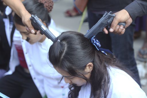 22일(현지시간) 미얀마 만달레이에서 쿠데타 규탄시위가 벌어진 가운데 한 여성이 군부 통치 아래 근무해야 하는 공무원을 상징하는 의미로 모형총 총구 아래 앉아있다. 만달레이=AP연합뉴스 |