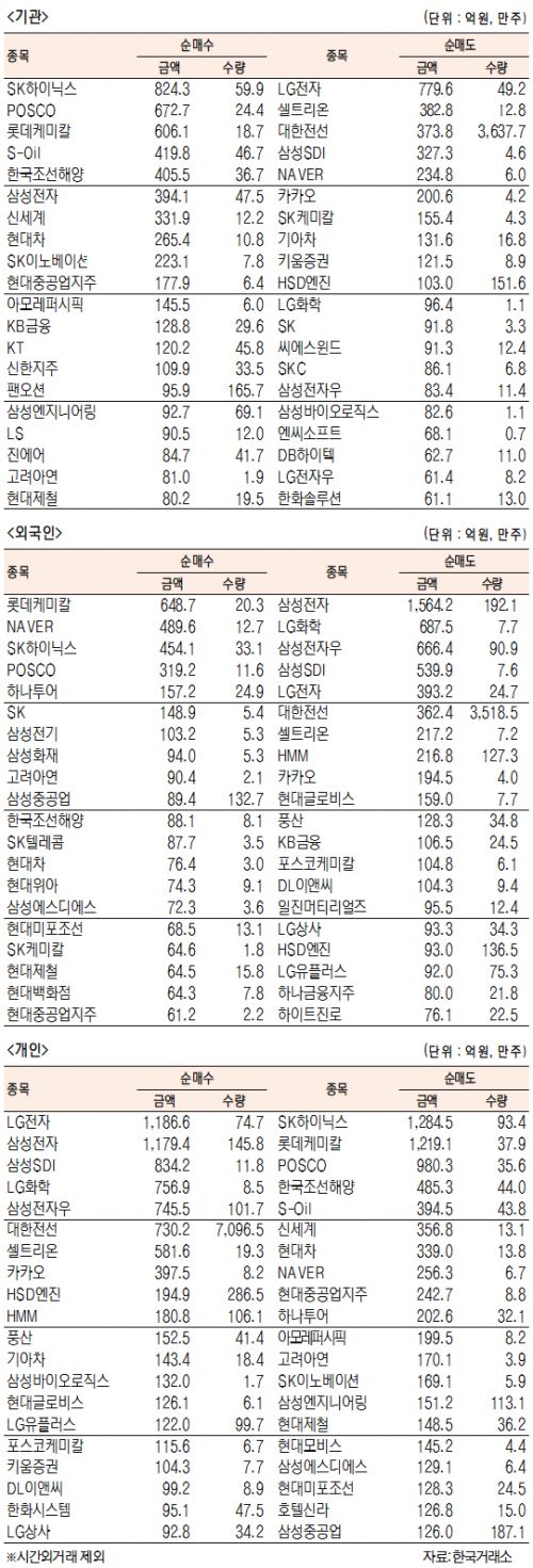 [표]유가증권 기관·외국인·개인 순매수·도 상위종목(2월 23일)