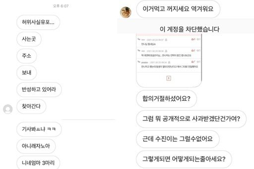 해당 메시지에는 “니가 뭔데 수진언니 건드리냐” “사는 곳 주소 보내 반성하고 있어라 찾아간다”, “자숙하면서 살아라”, “이거 먹고 꺼져라” 등 다소 과격한 내용이 담겨 있다.