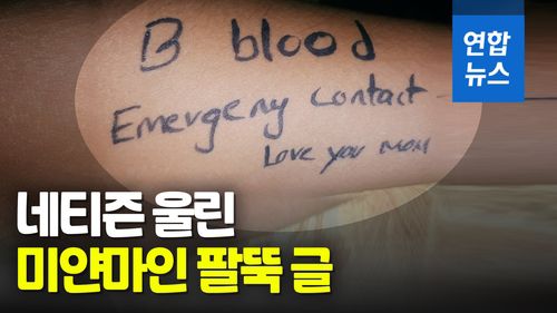 (서울=연합뉴스) 미얀마에서 군부 쿠데타에 반발하는 시위가 이어지고 있는 가운데 팔뚝에 혈액형과 긴급 연락처 등을 적은 사진이 현지 SNS에 올라왔습니다.