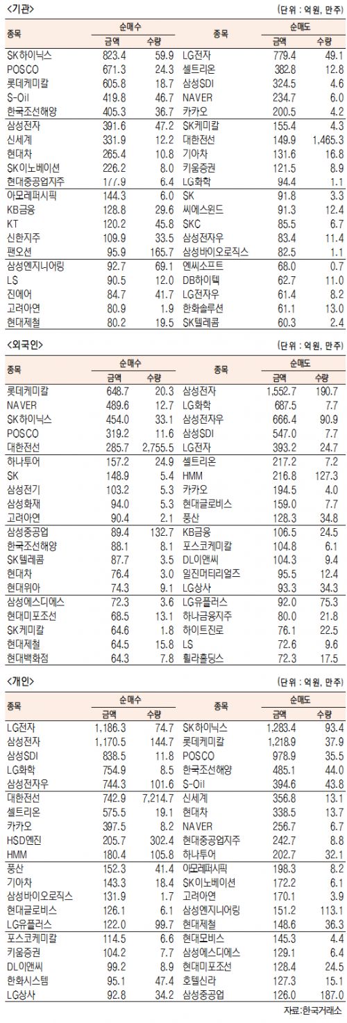 [표]유가증권 기관·외국인·개인 순매수·도 상위종목(2월 23일-최종치)