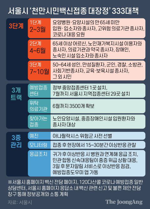 서울시는 3단계(대상)-3개 트랙(방법)-3중 관리(이상반응)의 ‘333 대책’을 준비했다고 밝혔다.