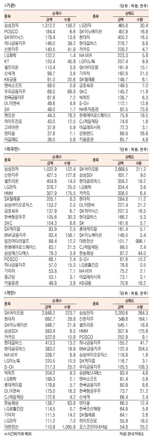 [표]유가증권 기관·외국인·개인 순매수·도 상위종목(2월 24일)