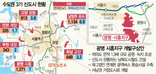 △ 광명 시흥 신도시의 광역교통 불편을 해소할 수 있는 효율적인 방법은 광역철도망 구축이다. 남북 연결 철도망을 건설할 예정으로, 세부 내용은 지구계획 수립단계에서 광역교통대책을 마련하면서 결정할 계획이다. 철도의 방식은 수요 등을 감안했을 때 경전철 방식이 유력하다. 시작점과 종점은 수요 분석을 해야 하지만 북쪽으론 신도림역, 남쪽으론 KTX 광명역·신안산선 학온역 등과 연결하는 방안을 검토 중이다. 지하철 1·2·7호선, 신안산선, 광역급행철도(GTX)-B 등과도 연계할 예정이다.