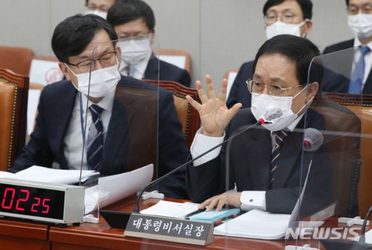 [서울=뉴시스최동준 기자 = 유영민 대통령 비서실장이 24일 서울 여의도 국회에서 열린 운영위원회 전체회의에서 질의를 듣고 있다. (공동취재사진) 2021.02.24. photo@newsis.com |