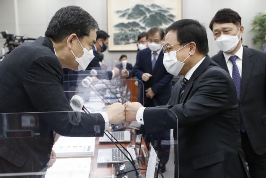 주먹 인사 유영민 대통령비서실장(오른쪽)이 24일 국회 운영위원회 전체회의에 출석해 곽상도 국민의힘 의원과 주먹 인사를 하고 있다. 국회사진기자단 |