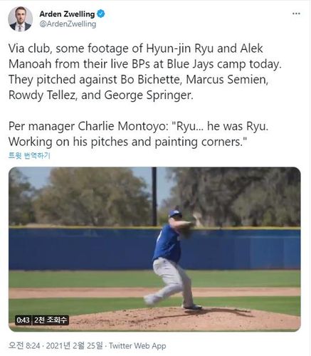 류현진의 라이브피칭 소식 알리는 스포츠넷 기자 |