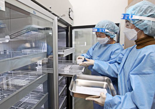 아스트라제네카 코로나19 백신 접종을 하루 앞둔 25일 서울 동작구 보건소에서 방역 관계자들이 백신을 냉장고에 옮기고 있다. (사진=연합뉴스) |