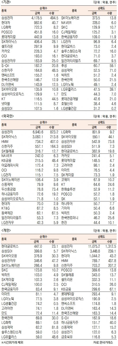 [표]유가증권 기관·외국인·개인 순매수·도 상위종목(2월 25일)