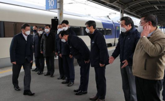 문재인 대통령이 25일 오후 부산 부산진구 부전동 부전역에서 열린 ‘동남권 메가시티 구축 전략 보고’ 행사에 참석하기 위해 들어서며 기다리던 참석자들과 인사하고 있다./사진=뉴시스 |