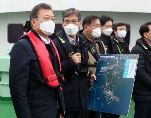 문재인 대통령이 25일 부산에서 열린 '동남권 메가시티 구축 전략 보고'에 참석, 가덕도 공항 예정지를 어업지도선을 타고 선상 시찰하며 이병진 부산시장 권한대행으로부터 관련 보고를 청취하고 있다. /연합뉴스 |
