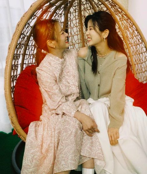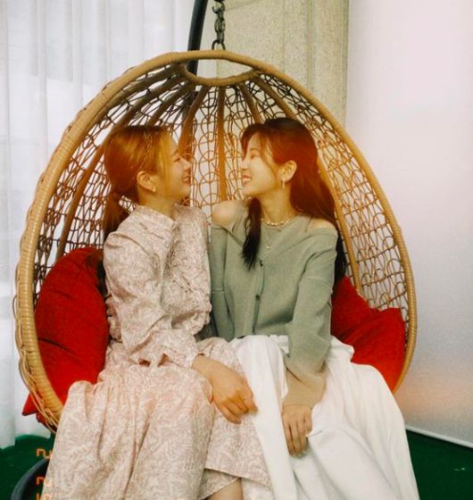 이날 올린 사진을 보면 라탄 그네 의자에 앉아 있는 윤보미와 박초롱의 모습이 담겨 있다.