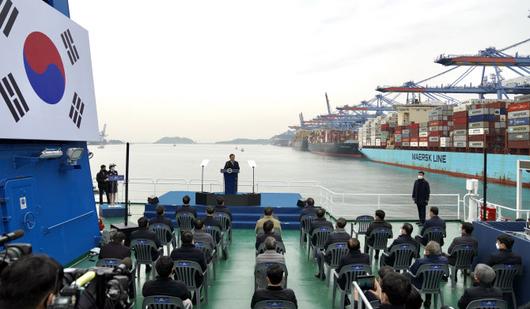 문재인 대통령이 25일 부산신항 다목적 부두에 위치한 해양대학교 실습선 선상에서 열린 ‘동남권 메가시티 구축 전략 보고’에서 발언하고 있다. (사진=연합뉴스) |