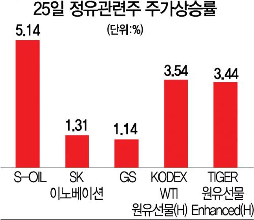 한국거래소에 따르면 25일 에쓰오일(S-Oil(010950))은 8만 8,000원에 거래를 끝내면서 전일 대비 5.14% 올랐다. 지난해 1월 2일 종가가 9만 1,900원이었다는 점을 고려하면 에쓰오일은 코로나 사태의 충격을 사실상 회복한 수준까지 돌아왔다. GS(078930)(3만 9,950원)는 이날 1.14% 올랐고 SK이노베이션(096770)은 1.31% 상승을 나타냈다. 전일 뉴욕 증시에서도 엑손모빌(3.00%), BP(4.42%) 등 주요 에너지 회사들이 시장을 주도했다. 최근 워런 버핏이 대거 쓸어담으며 시장의 주목을 받은 셰브런도 이날 3.69% 뛰었다.