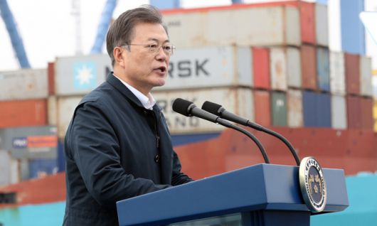 문재인 대통령이 25일 부산신항 다목적 부두에 위치한 해양대학교 실습선 한나라호 선상에서 열린 '동남권 메가시티 구축 전략 보고' 행사를 마치고 퇴장하고 있다. 연합뉴스 |