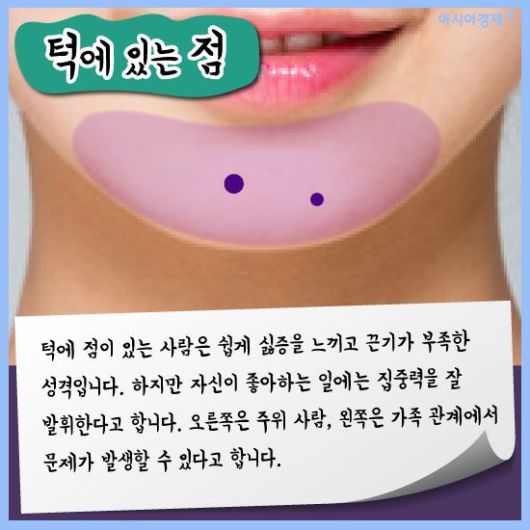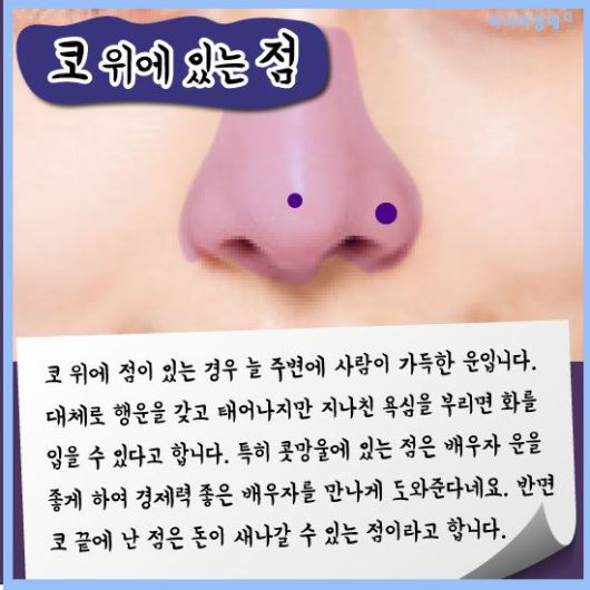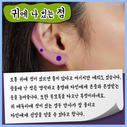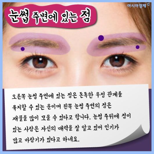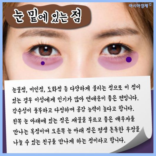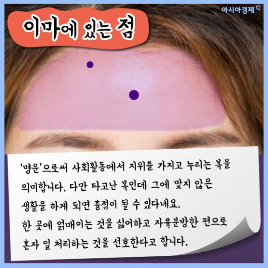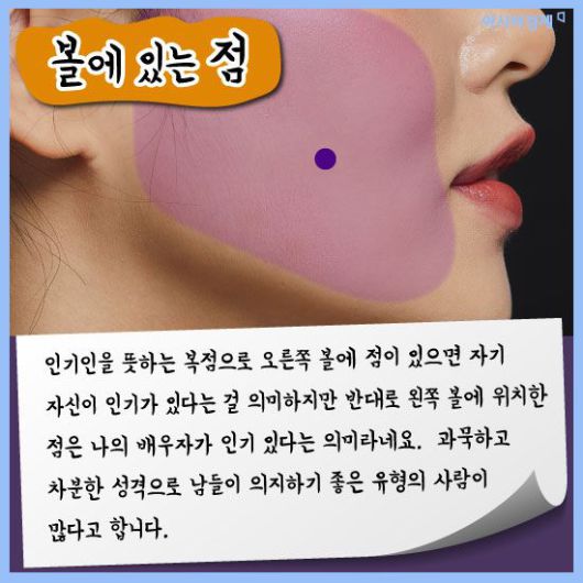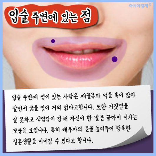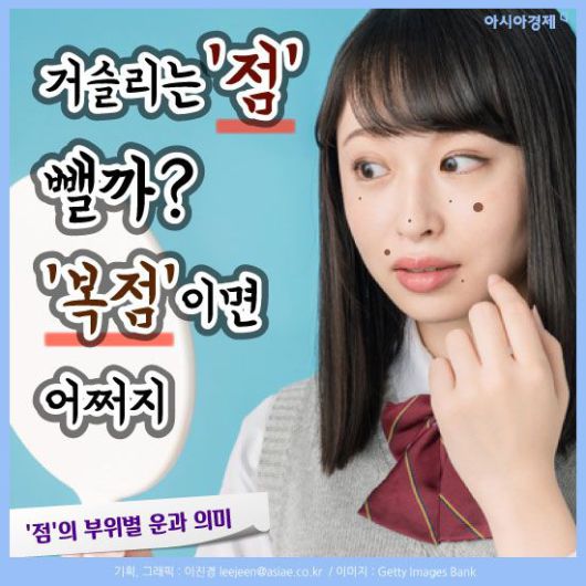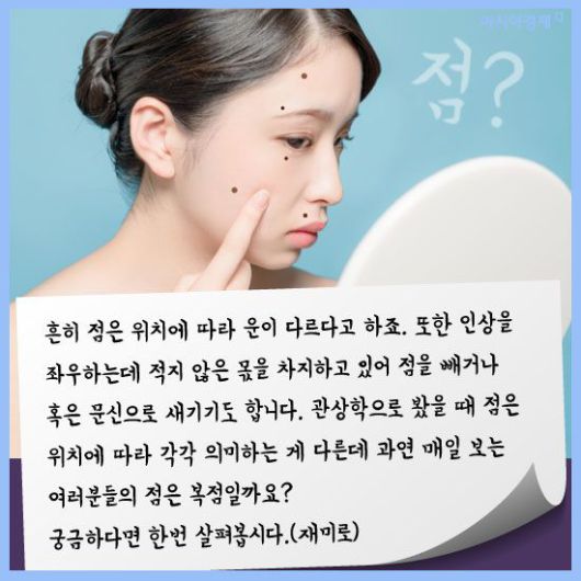 [아시아경제 이진경 기자] 흔히 점은 위치에 따라 운이 다르다고 하죠. 또한 인상을 좌우하는데 적지 않은 몫을 차지하고 있어 점을 빼거나 혹은 문신으로 새기기도 합니다. 관상학으로 봤을 때 점은 위치에 따라 각각 의미하는 게 다른데 과연 매일 보는 여러분들의 점은 복점일까요? 궁금하다면 한번 살펴봅시다.(재미로)