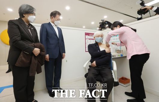 [더팩트ㅣ이철영 기자·청와대=허주열 기자] 문재인 대통령은 26일 코로나19 백신의 국내 첫 접종을 시작한 현장을 방문해 상황을 점검했다.