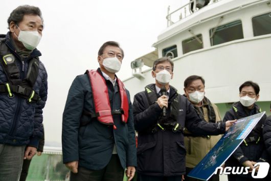 문재인 대통령이 25일 오후 부산에서 열린 '동남권 메가시티 구축 전략보고'에 참석해 가덕도 공항 예정지를 선상 시찰하고 있다./사진=뉴스1 |
