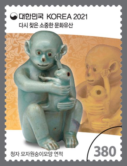 청자 모자원숭이모양 연적(국보 제270호)은 간송 전형필이 1937년 영국인 수집가 존 개스비에게서 구매한 작품이다. 아름다운 비취색과 뛰어난 상형 기술을 자랑한다. 문화재청 측은 "고려시대 청자로 만든 연적 가운데 유일하게 원숭이 모자(母子)가 표현됐다"며 "어미의 엉거주춤한 자세, 보채는 새끼의 모습 등으로 원숭이 모자의 사랑을 재미있게 묘사했다"고 설명했다.