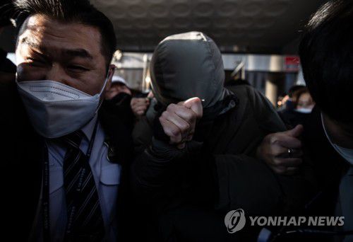 항의 받으며 법원 나서는 '정인이' 양부 안 모 씨 |