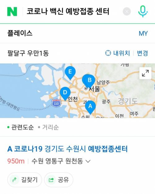 네이버에서 ‘코로나백신예방접종센터’, ‘코로나19예방접종센터’, ‘코로나19백신예방접종센터’ 등 키워드를 검색하면 가까운 예방접종센터들을 확인할 수 있다. ‘경기도 코로나백신예방접종센터’와 같이 키워드와 지역명을 조합해 특정 지역 접종 정보 확인도 가능하다. 이 정보는 네이버 지도 앱에서도 확인할 수 있다.