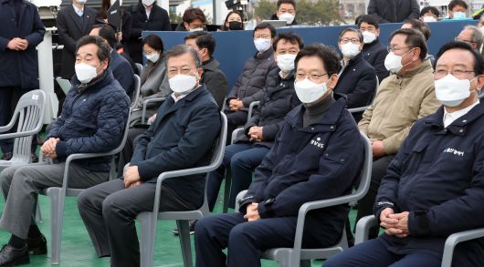 25일 부산신항 다목적 부두에 위치한 해양대학교 실습선 한나라호 선상에서 열린 '동남권 메가시티 구축 전략 보고'에 참석한 문재인 대통령과 더불어민주당 이낙연 대표, 김경수 경남도지사. /연합뉴스 |