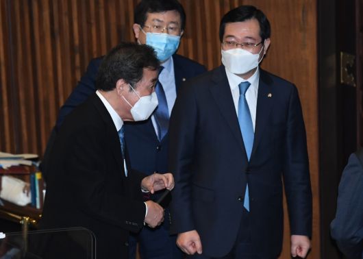 이낙연 더불어민주당 대표가 26일 오후 국회 본회의에서 가덕도신공항 건설을 위한 특별법안이 통과된 뒤 본회의장을 나서고 있다. 이상섭 기자 |
