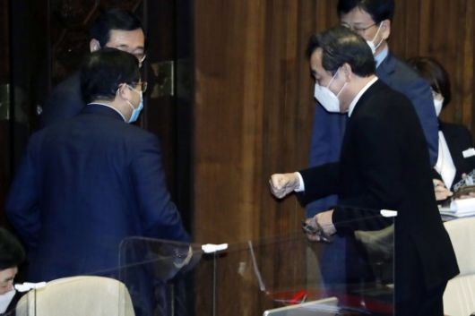 더불어민주당 이낙연 대표가 26일 서울 여의도 국회 본회의에서 가덕도신공항 건설을 위한 특별법안(대안)이 가결되자 동료 의원들과 인사하고 있다. |