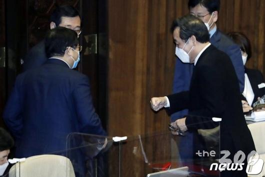 (서울=뉴스1) 박세연 기자 = 더불어민주당 이낙연 대표가 26일 서울 여의도 국회 본회의에서 가덕도신공항 건설을 위한 특별법안(대안)이 가결되자 동료 의원들과 인사하고 있다. 2021.2.26/뉴스1 |